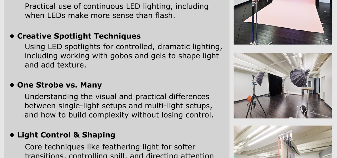 Hands-on use of studio strobes and continuous lights, including attaching lights to stands, using softboxes and other modifiers, and safely connecting power and triggers.